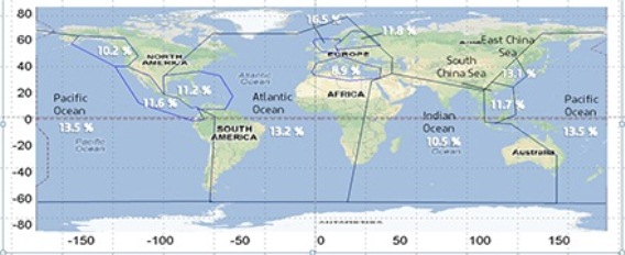 The average sea margin does not of course tell the whole truth about the environmental conditions in that area, the environmental conditions vary seasonally and on some sea areas the conditions are always harsher. When we look at the sea margin distributions for the Mediterranean Sea and Pacific Ocean, we can see that in the Mediterranean Sea, the sea margin on the average is more likely to be less than 10%. The probability of the sea margin being over 20% is lesser than on the average. On the other hand in the Pacific Ocean it is the other way around. There the sea margin is likely to be higher than the average and sea margins of over 20% are more probable. Showing the seasonal variation in the sea margin distributions would give even better insight of the changes in operating cost between different areas. When planning high level fleet deployment, the differences in energy consumptions in different areas due to sea margins should therefore be taken into account. For example operating in Mediterranean or in the Caribbean has over 2 % difference in propulsion energy usage of the vessel. This is already a significant difference on fuel bill.