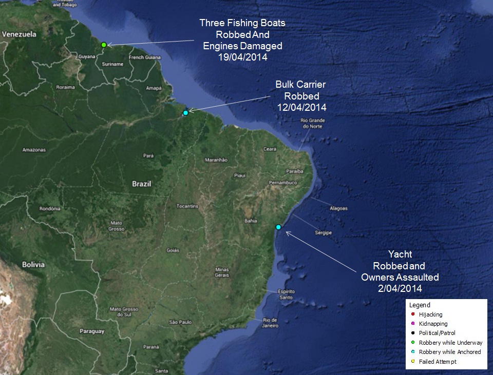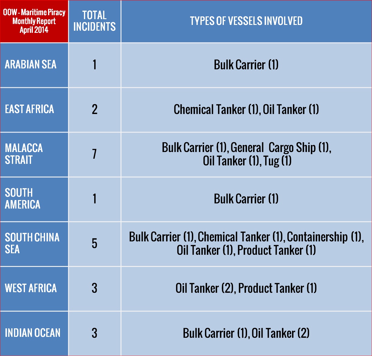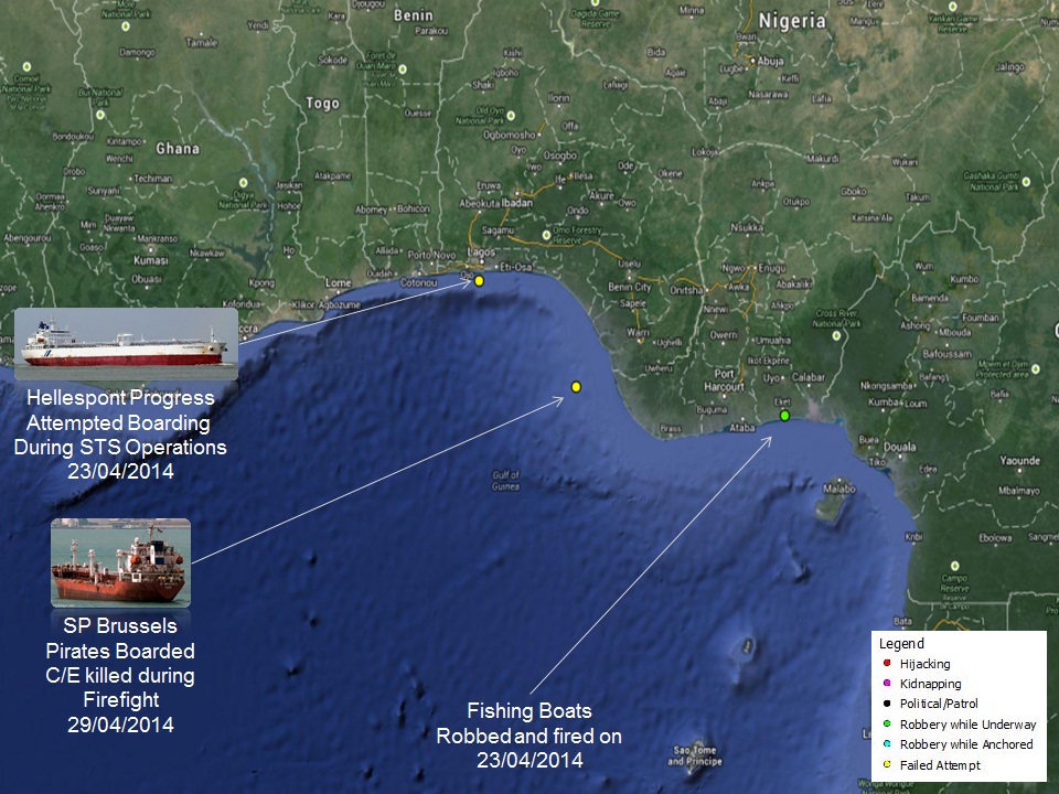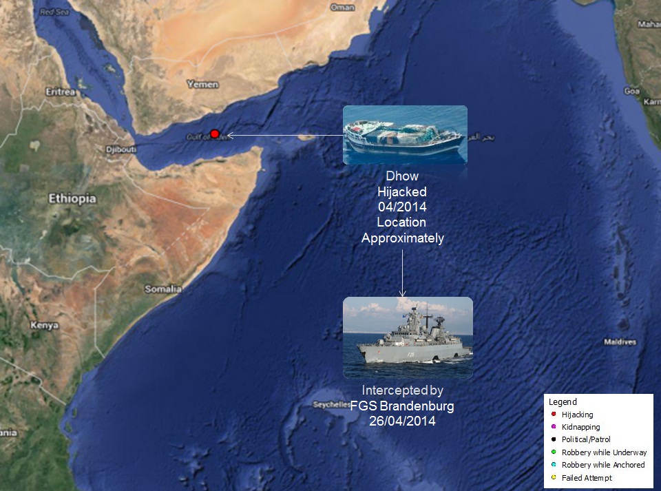 On 29 April 2014 two armed pirates attacked the product tanker, SP Brussels approximately 35nm West of Bayelsa Province, unfortunately this attack resulted in the death of the Chief Engineer and injuries to the Third Officer. Two product tankers were hijacked in April 2014 in the Malacca/Singapore Straits. In both the attacks the pirates were heavily armed. Five incidents were reported in April 2014 at Pulau Bitan, Indonesia. Several attacks took place in the Singapore Straits in 2013 and 2014. Finally the EU NAVFOR warship, FGS Brandenburg managed to intercept a dhow in the Gulf of Aden on 26 April 2014.