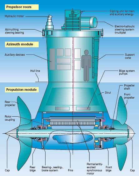 The SSP system is combining the functions of propulsion, steering and stem thruster into one unit. It is using a twin propeller combined with a hydrodynamically optimized propulsion module which includes a permanently excited propulsion motor.