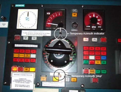 Regarding the wheelhouse controls, which are of particular interest for the accident being discussed, the primary control is by the “electric shaft system” a type approved item used by several manufacturers of propulsion systems, and the secondary via back-up a back system of push buttons controlling speed and azimuth. This system is selected either manually or automatically(when the primary control failed).