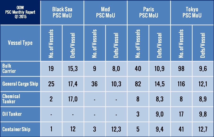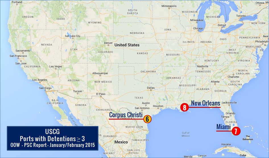 In USA, until the date this report was published, for Q1 2015 over half of the vessels’ detentions were recorded in the following places: New Orleans (8), Miami (7) and Corpus Christi (6). In total there were 32 detentions in the USA for Q1 2015. It is worth mentioning that the USCG publishes a report with the vessels that have been detained on a monthly basis. In this particular report one can find detailed information about each detention.