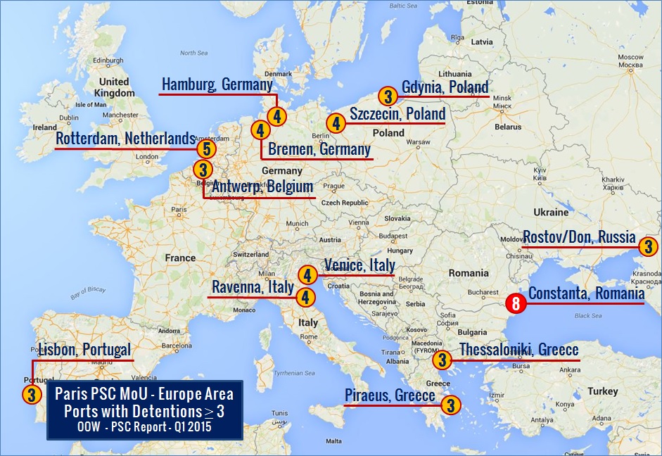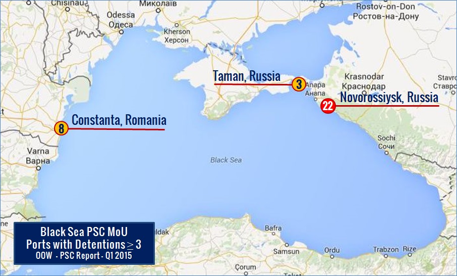 For the Black Sea PSC MoU the place with the highest number of detentions is Novorossiysk in Russia where for Q1 of 2015 a total of 22 detentions were recorded. Constanta in Romania recorded 8 detentions and Taman in Russia 3 detentions. More than half of the total detentions in Black Sea PSC MoU were recorded in the places mentioned above.