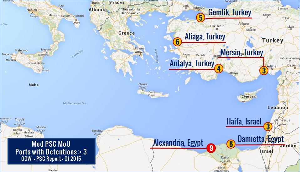 In the Mediterranean PSC MoU Alexandria in Egypt recorded most of the detentions for Q1 2015. More specifically 9 detentions took place in Alexandria while 5 detentions took place in Damietta, Egypt. Other places worth mentioning is Aliaga (6), Gemlik (5), Antalya (4), Mersin (3) in Turkey and Haifa in Israel with 3 detentions.