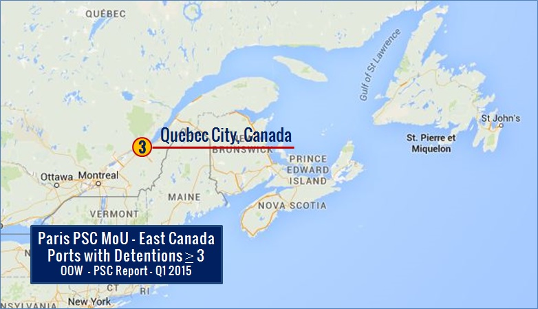 For the Paris PSC MoU area most of the detentions were recorded in ports of North Europe, Rotterdam (5), Bremen (4), Hamburg (4), Szczecin (4), Gdynia (3), Antwerp (3). In Southern Europe detentions were recorded in Venice (4), Ravenna (4), Lisbon (3), Piraeus (3), Thessaloniki (3). The port with the highest number of detentions is Constanta in Romania with 8 detentions, it should be noted that Romania as a country participates both in the Paris PSC MoU as well as in the Black Sea PSC MoU and thus relevant data were the same in the databases of the Paris and Black Sea PSC MoUs. In these cases one practical question that one may ask is “What type of report does the PSCO leaves onboard? A PSC Report of the Paris MoU or of the Black Sea MoU or both?”. Finally 3 detentions were recorded in Canada’s Quebec City.