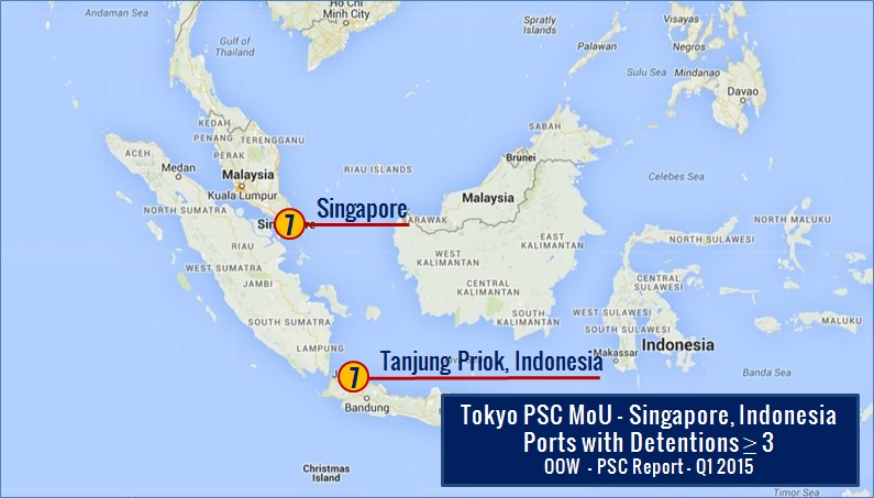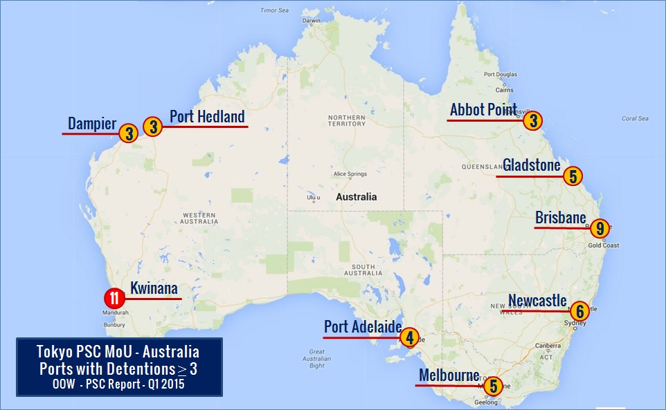 As it can be seen from the illustrations above in the Tokyo PSC MoU area one of the most active countries in terms of detaining vessels is China. There were 15 ports which recorded more than 3 detentions for Q1 2015 and it is also worth mentioning that some of them recorded well above 10 detentions. These were Shenzhen (14), Yantai (13), Ningbo (11), Tianjin (10). Hong Kong recorded 15 detentions in total which is the highest number in the entire Tokyo MoU. In Japan, it is worth mentioning that there were 12 detentions for Q1 2015. In Singapore there were 7 detentions and in Tanjung Priok 7 detentions as well. In Australia (AMSA), a fair amount of detentions was recorded with Kwinana port being the one with the highest number (11 detentions).