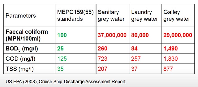 As a general guide, galley grey water is similar in pollution content to black water, says Chen. Overall, cruise ship grey water contains far more pollutants than black water. For merchant ships the difference is not as great, but still significant. However, the cruise ship sector has made a significant commitment to grey water treatment. Some advanced technologies produce treated wastewater of far better quality than that discharged from the equivalent facilities on land.