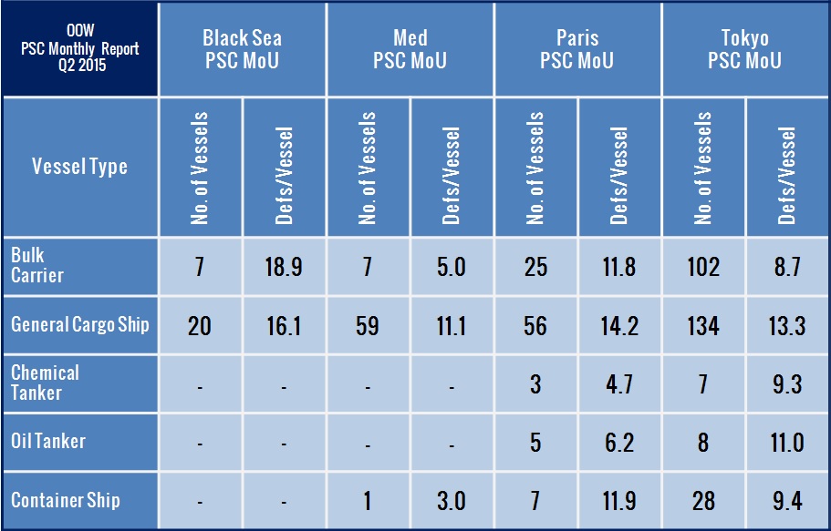 For Q2 2015 in the Black Sea PSC MoU area the number of Bulk Carriers was decreased considerably although the average number of deficiencies was increased. The number of the detained General Cargo Ships also decreased along with the respective average number of deficiencies raised during the PSC inspection.It is worth noting that in the Black Sea PSC MoU area no deficiencies were noted for Chemical Tankers, Oil Tankers and Containerships. For the Mediterranean PSC MoU, in overall, the number of the detained Bulk Carriers, General Cargo Ships and Containerships was increased, especially for General Cargo Ship were it was raised from 36 vessels in Q1 2015 to 59 vessels for Q2 2015. For the Paris PSC MoU area the number of detained vessels was decreased for all vessel types with the exception of Oil Tankers where 5 vessels got detained during Q2 2015. For the Tokyo PSC MoU area (Asia-Pacific region) for Bulk Carriers and General Cargo Ships the number of detained vessels was increased. On the contrary detentions for Chemical Tankers, Oil Tankers and Containerships were less during Q2 2015.