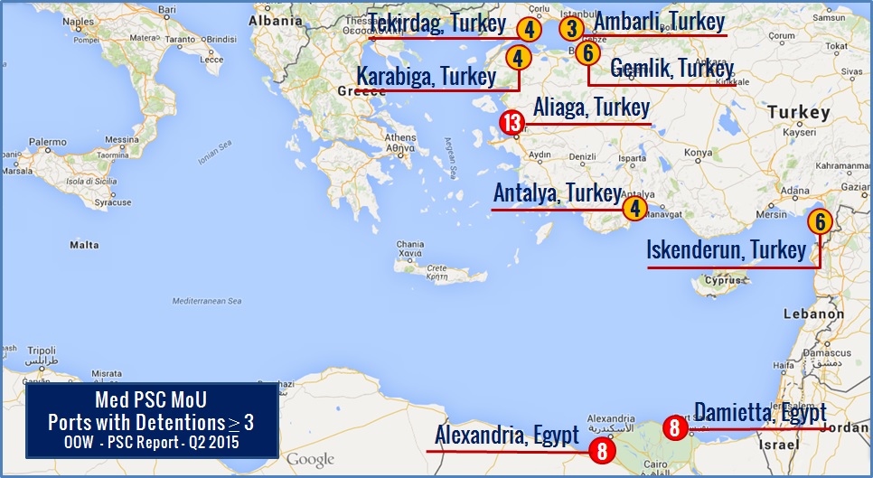For the Mediterranean PSC MoU what is worth noting is the fact that the majority of the ports where more than 3 detentions were recorded were Turkish ports. The detained vessels in Alexandria in Egypt still remains high were 8 vessels were detained during Q2 2015. The same number of detained vessels was also observed in Damietta, Egypt.