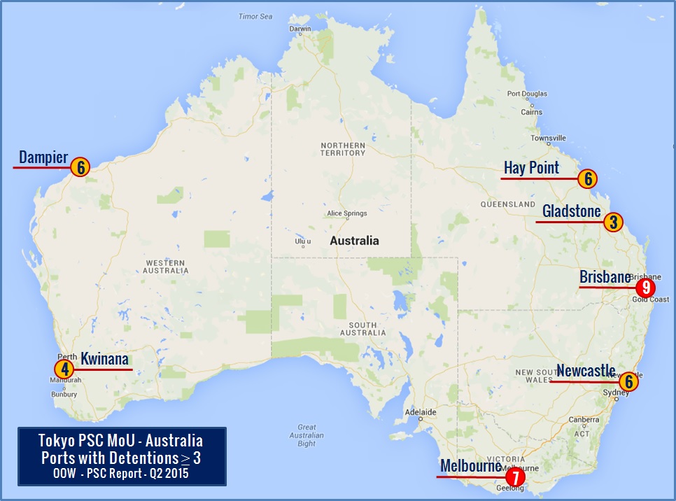 For the Tokyo PSC MoU the most notable ports where a great numbers of detentions occurred were: Nagoya in Japan, Tangshan/Tianjin/Weihai/Lianyungang/Xiamen/Shenzhen/Hong Kong in Chian, Singapore, Tanjung Priok in Indonesia and Brisbane/Melbourne in Australia.